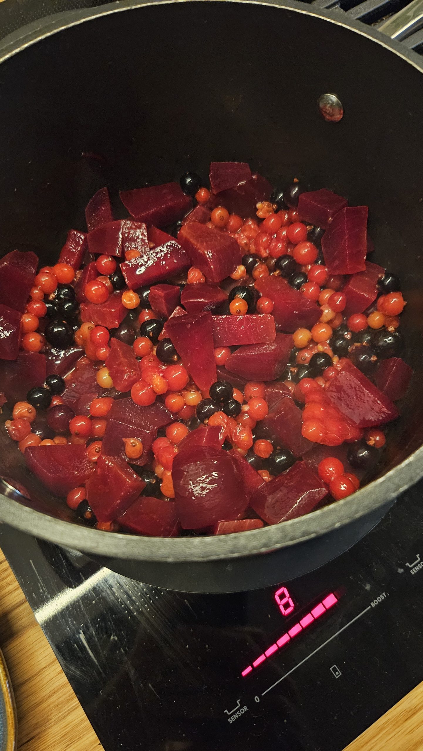 Doe de stukjes biet (eerst gekookt en zonder schil), de rode bessen, de zwarte bessen (diepvries of vers) en het citroensap in een pan. Breng aan de kook en laat 10 minuten zacht koken tot de bessen openbarsten en de biet goed zacht is.