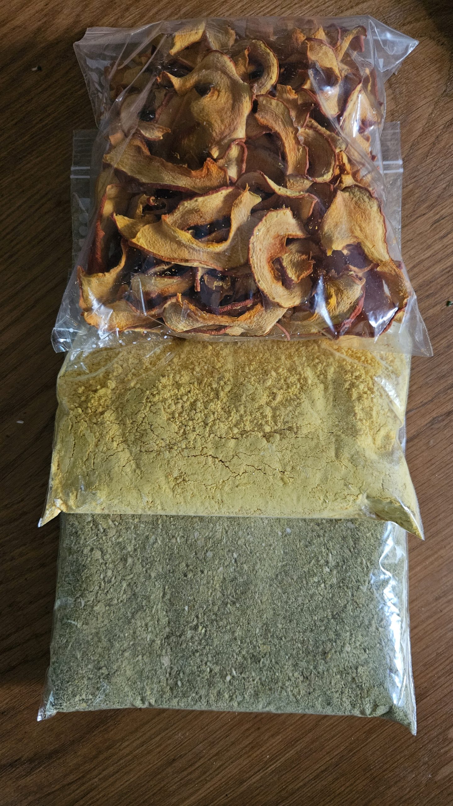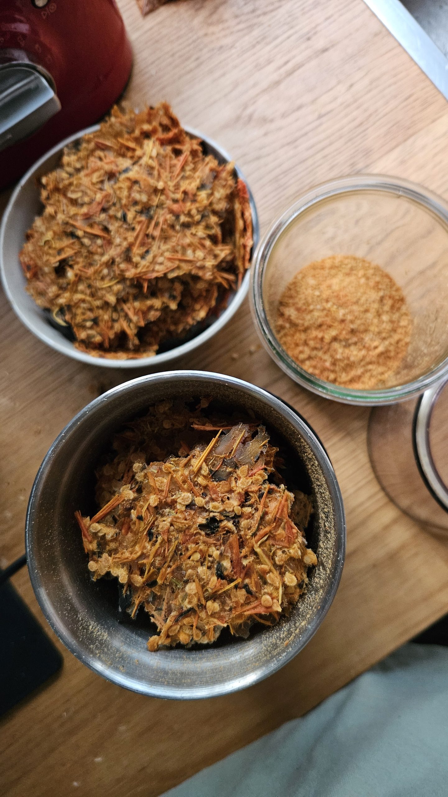 Je kunt van de gedroogde groenten, fruit en kruiden ook heel eenvoudig poeders maken. Deze poeders zijn ontzettend veelzijdig: je kunt ze gebruiken in cakes en taarten, door de yoghurt of smoothie mengen, of als kleurrijke en smaakvolle garnering over allerlei gerechten strooien. Het fijnmalen gaat het best met een koffiemolen of bonenmaler; daarmee krijg je een mooi, gelijkmatig poeder dat perfect werkt voor al je recepten.